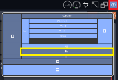 もう1つは下図の赤枠部分、画面右上の目の書かれたアイコンをクリック、そのあと黄色枠部分をクリックしてMIDIエディタを表示させる方法です。