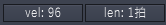 MIDIエディタ内でクリックすることでその位置にMIDIノートが置かれます。ベロシティ(音の強さ)は「vel:」、長さは「len:」の値のとおりです。
